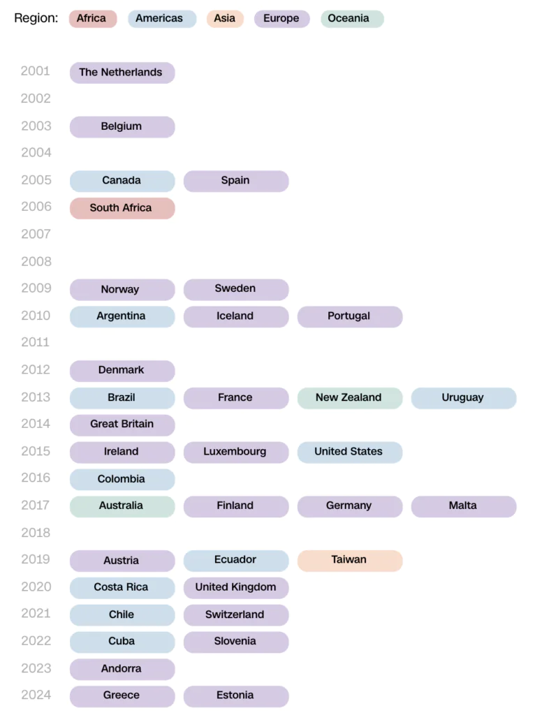 Below is a list of the countries currently recognizing LGTBQ+ marriages, and the timeline of when they first started recognizing same-sex marriage.